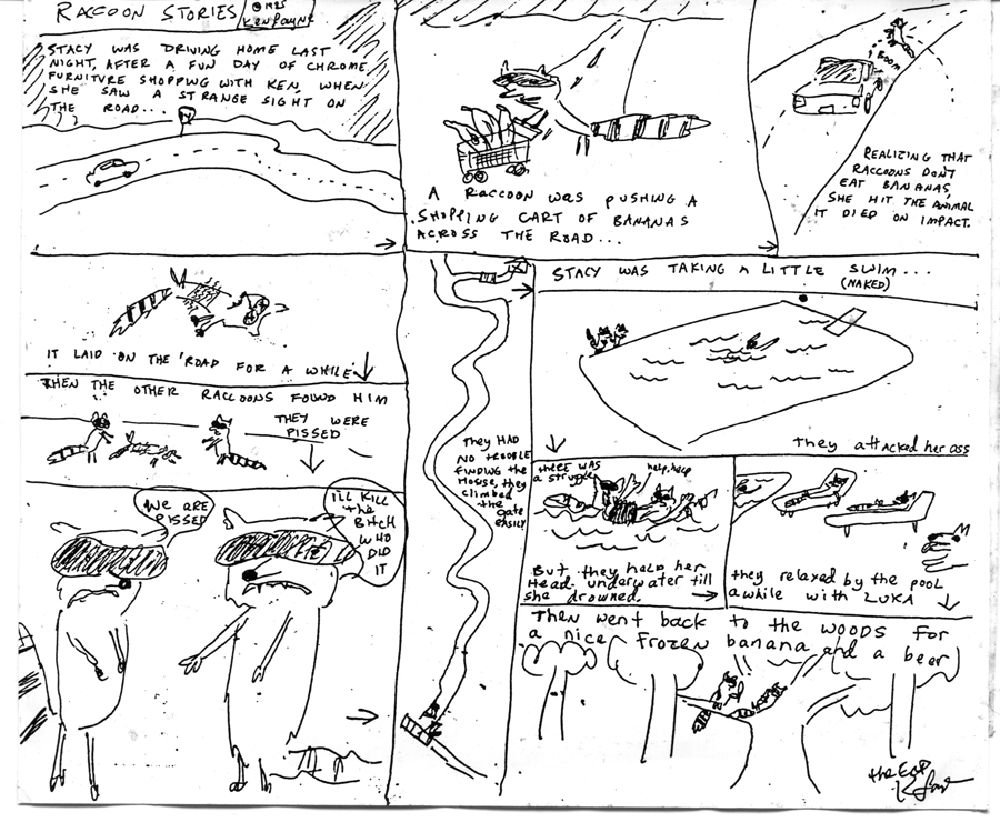 ![]() The Raccoon Stories comic strip was born in 1985 when Ken Layne was bored waiting for his wife, Staci, a reporter at the Daily Aztec at San Diego State University, to finish a story so they could leave. Staci had inadvertently run over a raccoon on the way to her home in scenic Dulzura, Calif., the night before and, while waiting at the Aztec office, Ken drew a little interpretation of the killing scene to cheer her. At the time, I was editorial page editor of the Aztec. Working that night while Ken drew, I watched over his shoulder. When he finished, I seized the crude drawing from Staci and, over Ken's horrified if slightly inebriated objections, ran it in the paper (below).